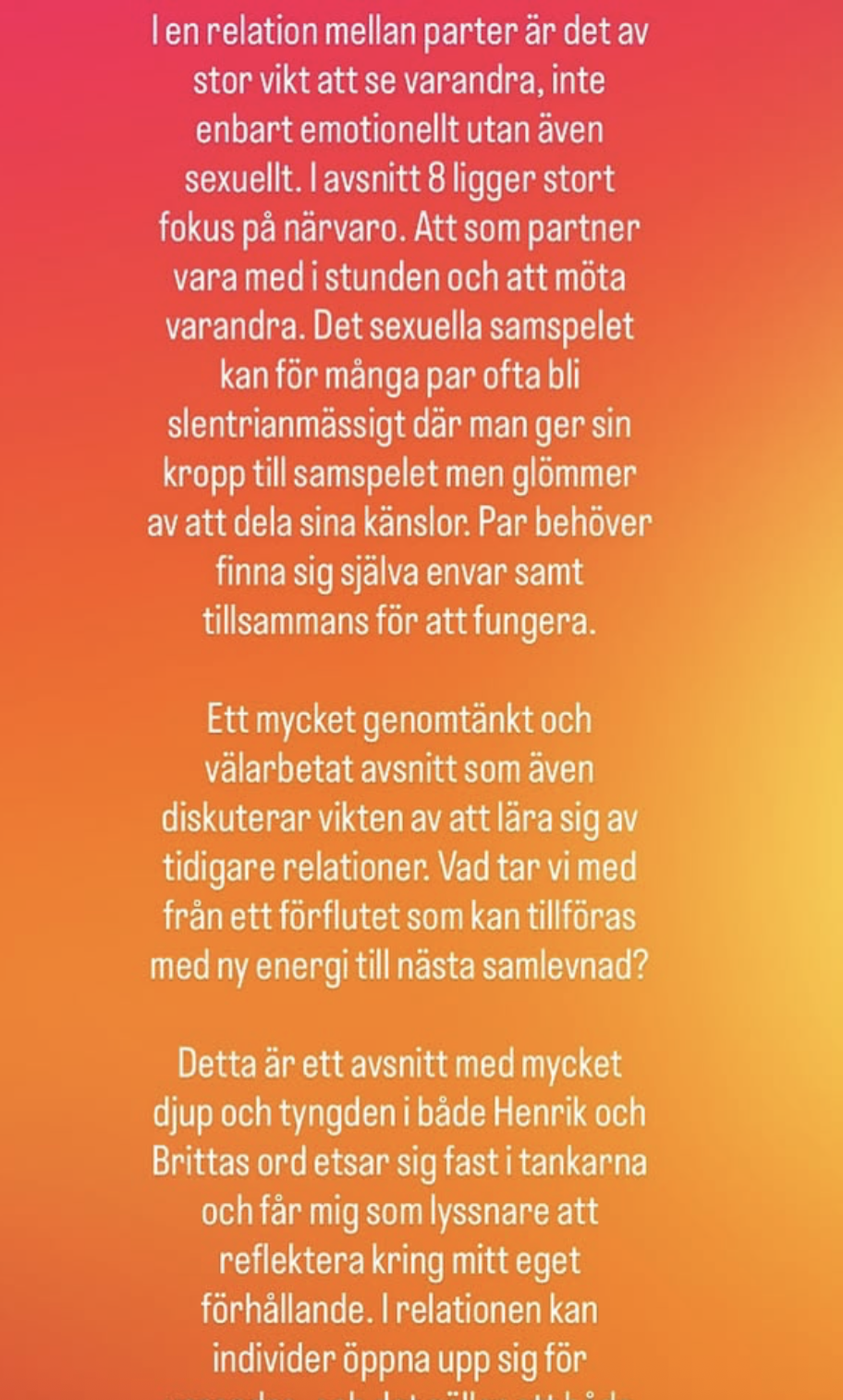 This is a very profound episode, and the weight of both Henrik and Britta's words sticks in my mind and makes me, as a listener, reflect on my own relationship. In a relationship, individuals can open up to each other, and it's important to both give and take. Vulnerability is something we allow together. It is together, in our interaction, that we work out our sexual relationship and our needs.